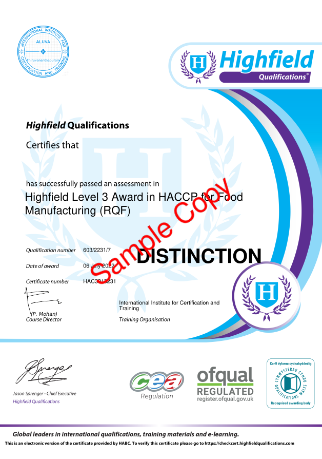 HABC (Highfield Awarding Body for Compliance, UK) Qualifications on HACCP/Food Safety are well recognized globally.